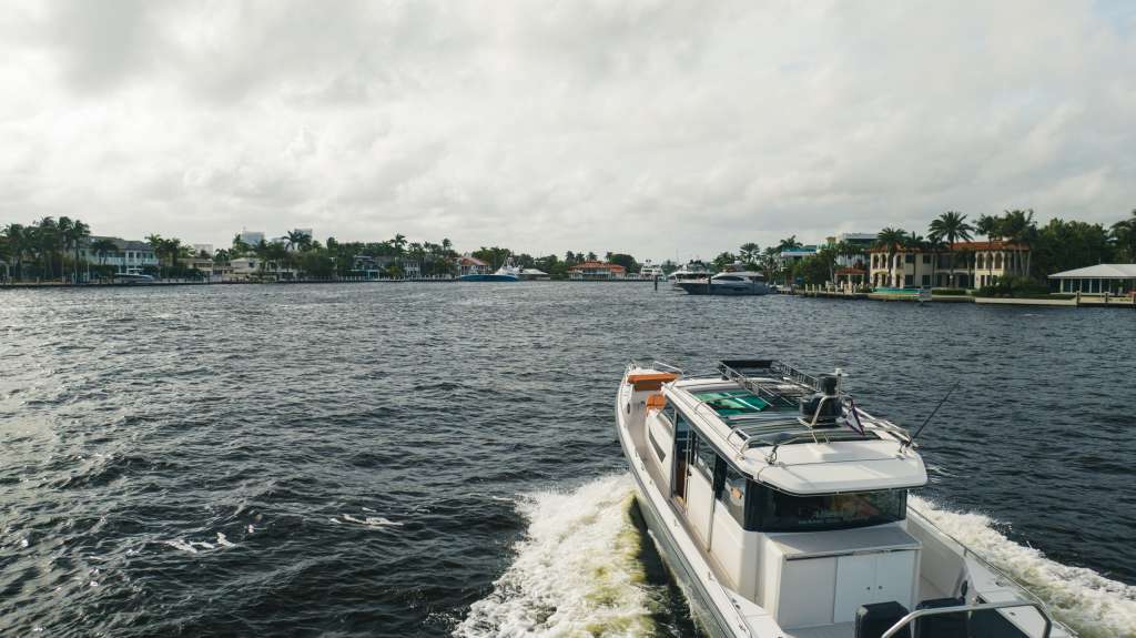 The vessel’s cutting-edge design includes a spacious forward cabin with panoramic windows, allowing you to enjoy air-conditioned comfort while taking in Fort Lauderdale’s stunning waterfront views. The innovative walk-around side decks provide easy access to the entire boat, while the multi-functional foredeck offers a perfect space for sunbathing or socializing. The aft deck features comfortable seating and can be easily converted for various activities, from dining to water sports.